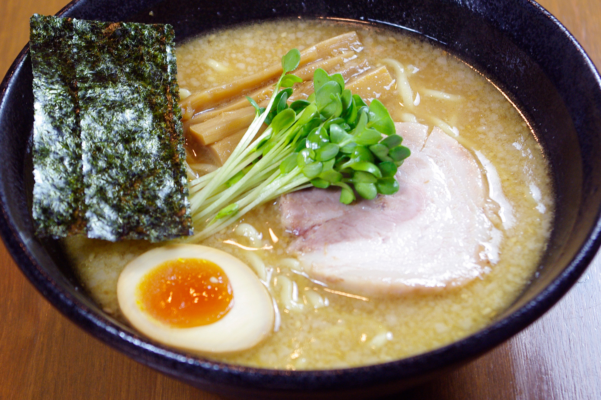 3種類のみそをブレンドした白みそベースのスープ。サラッと軽妙に、それでいて香り・旨味が充分。みそ本来の純粋な味わいが楽しめます。味のアクセントになる辛味のトッピングがオススメ!