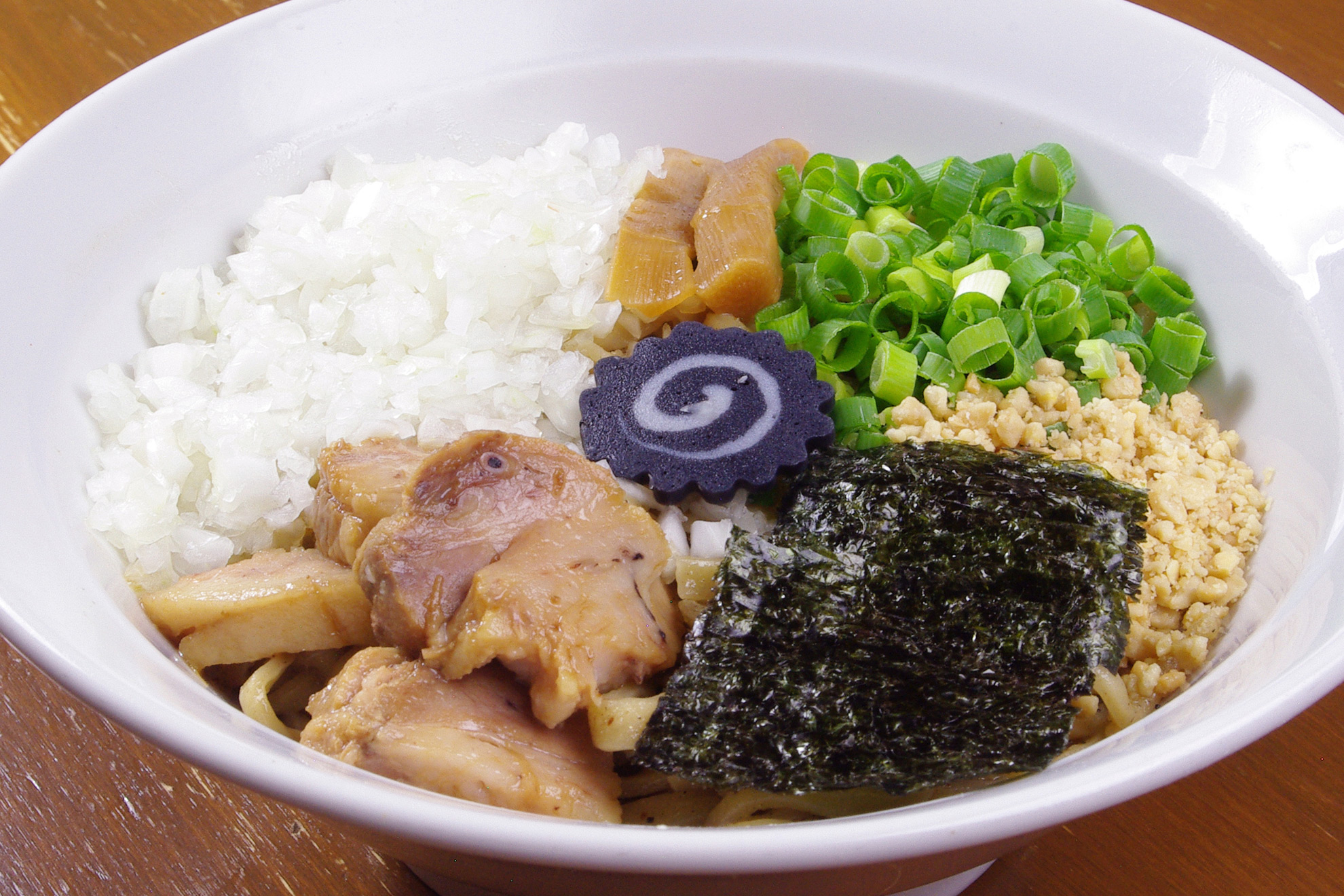 煮干しの強烈な風味とそれに負けない極太麺の強さ。クラッシュピーナッツ、玉ねぎ、極太メンマ、万能ねぎも抜群の存在感。づけチャーシューは、ドラニボ用に甘めの味付けで仕上げました。